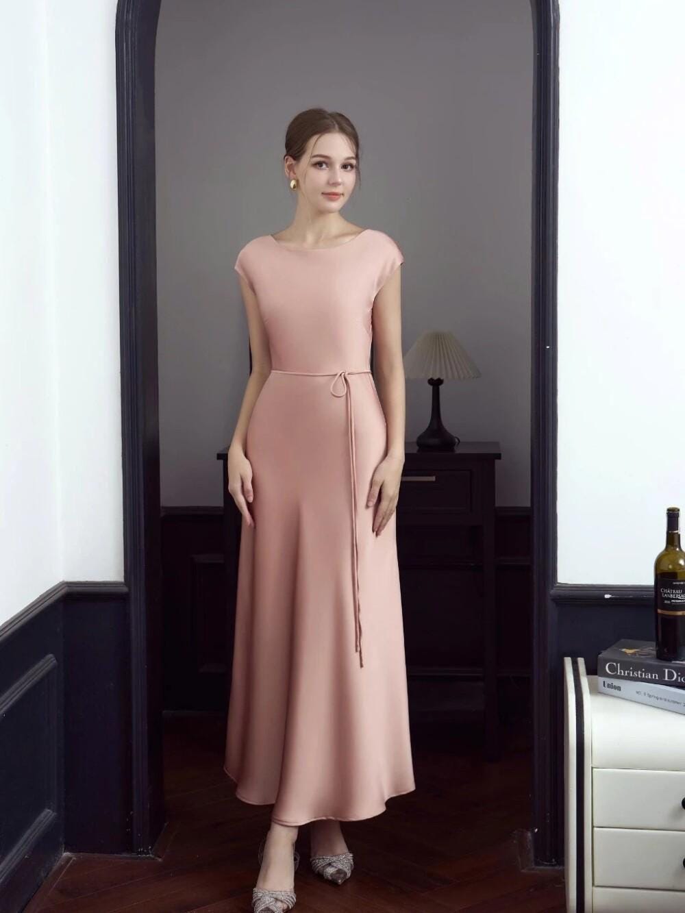 Our silk dress drapes in a flattering A-line cut, brushing the waist and flaring softly. Choose your favorite neckline (Round, V, Square, Boat) and sleeves (from sleeveless to long straight). Satin-lined pockets are discreetly hidden at the hips. Length falls mid-calf or ankle.